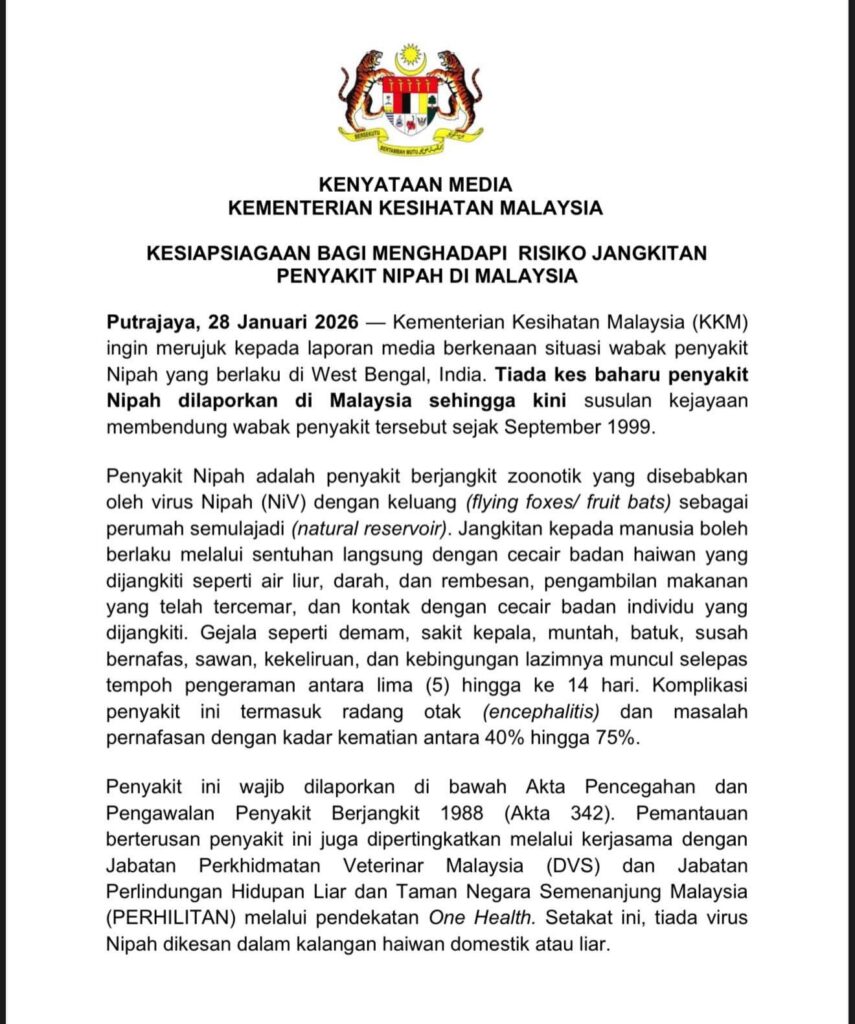 Kebimbangan Penularan Virus Nipah, KKM Perketat Kawalan Kesihatan Di Semua Pintu Masuk