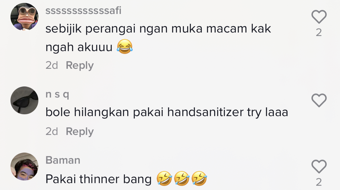 Dalam pada itu, tinjauan di ruangan komen mendapati rata-rata netizen turut terhibur melihat situasi lucu tersebut. Malah, ada juga yang turut berkongsi solusi untuk menghilangkan kesan permanent marker itu.