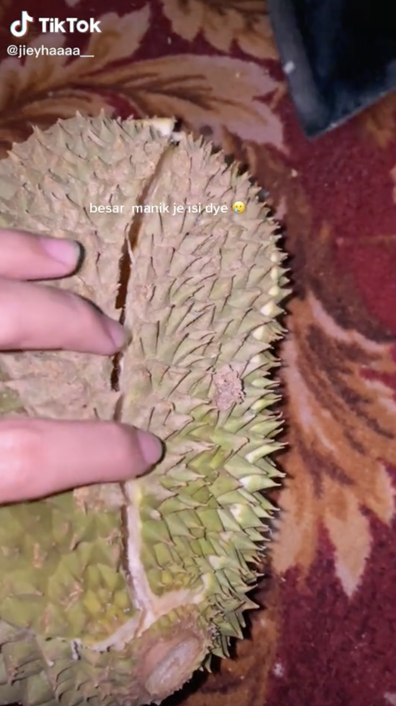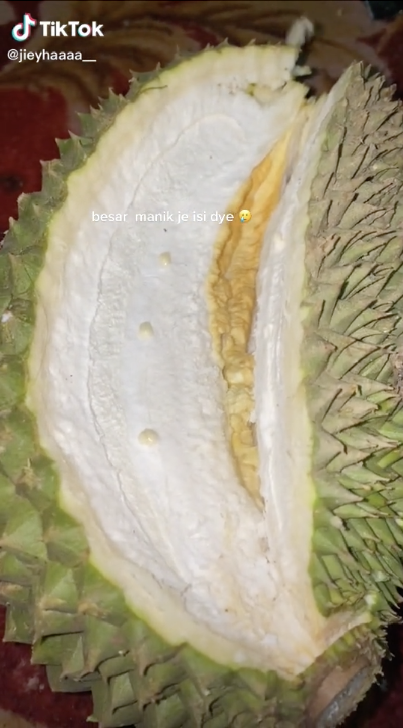 Menerusi video yang dikongsikan oleh @jieyhaaaa__ di TikTok, kelihatan rakaman menunjukkan sebuah durian yang baru dikupas.