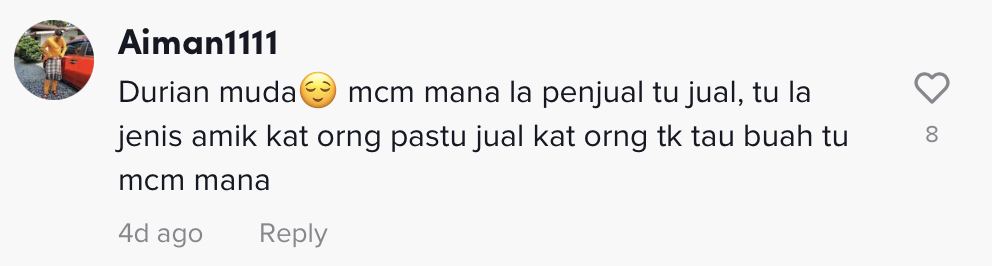 "Lain kali beli durian minta buka siap-siap, nampak isi baru beli. That tips sebab kadang kita beli tak semua berisi nanti satu row je ada isi" – Netizen