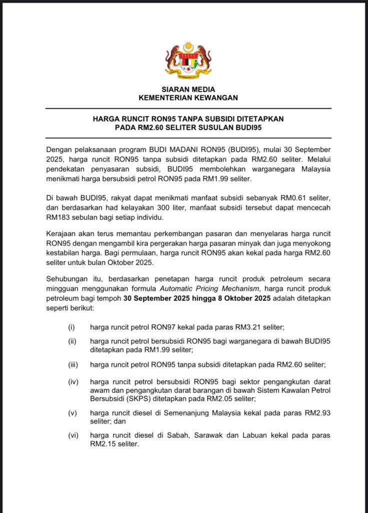 "Dengan pelaksanaan program BUDI MADANI RON95 (BUDI95) mulai 30 September 2025, harga runcit RON95 tanpa subsidi ditetapkan pada RM2.60 seliter.
