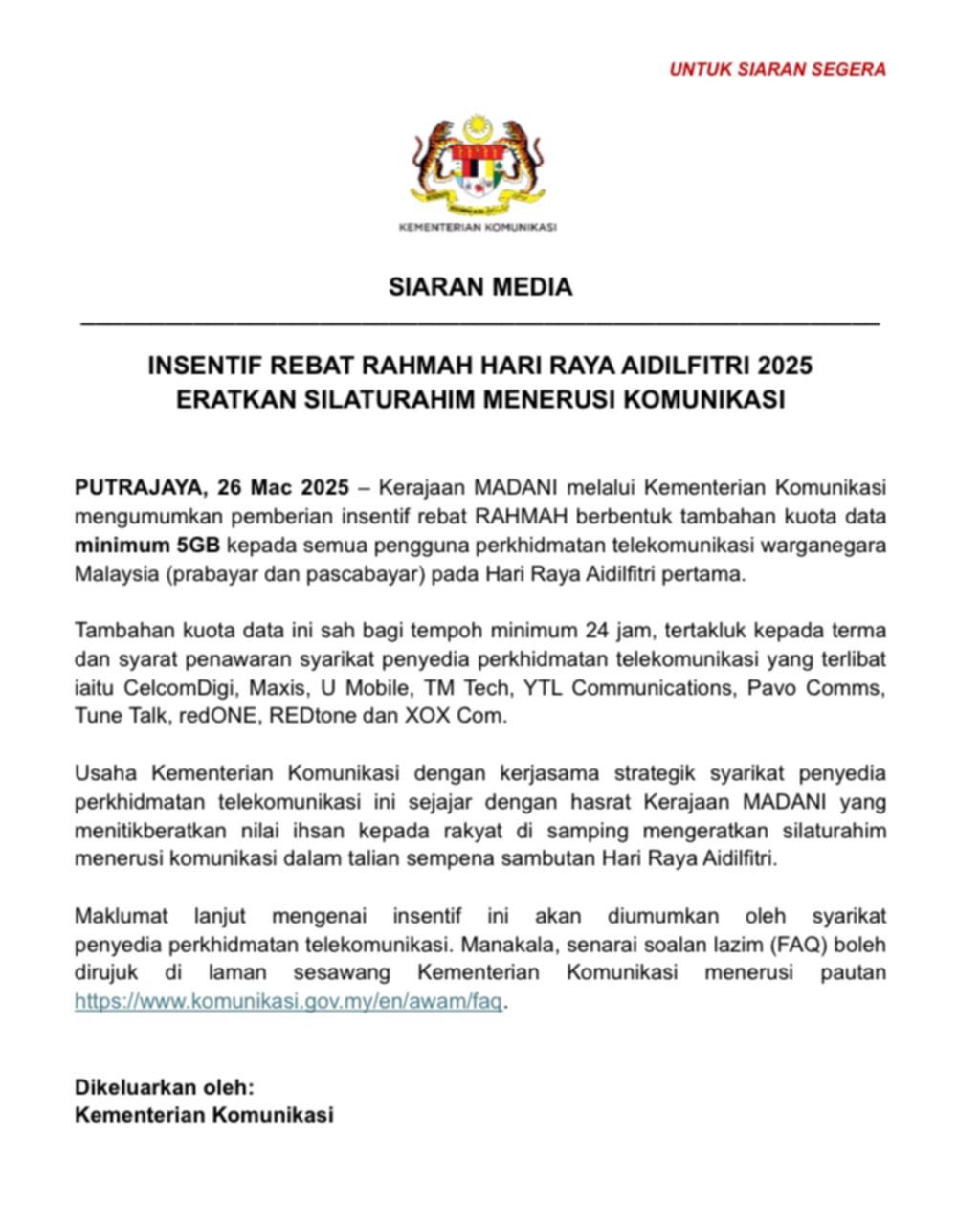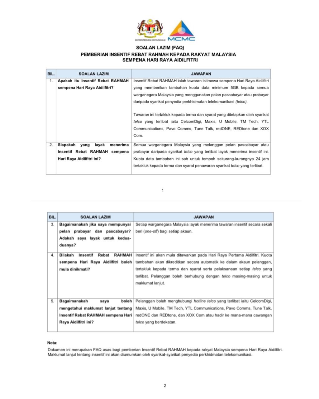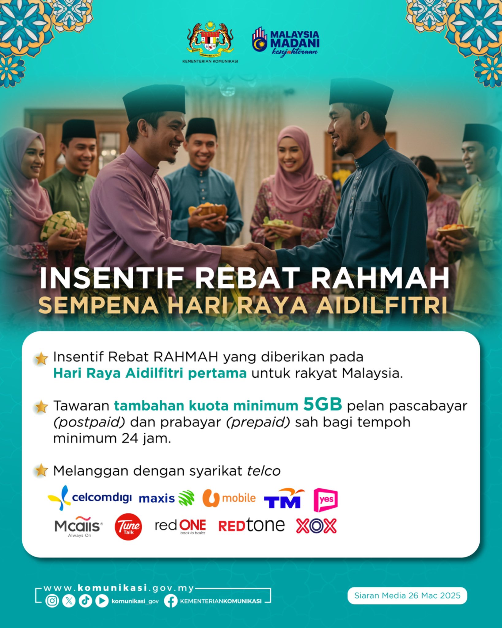 Kerajaan MADANI hari ini mengumumkan pemberian rebat RAHMAH tambahan kuota data minimum 5GB (gigabit) kepada semua pengguna perkhidmatan telekomunikasi pascabayar dan prabayar warga Malaysia pada hari pertama Aidilfitri ini