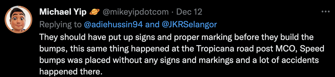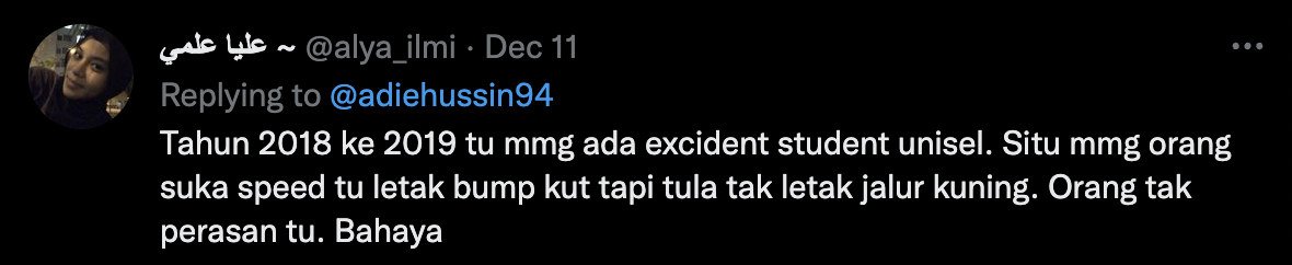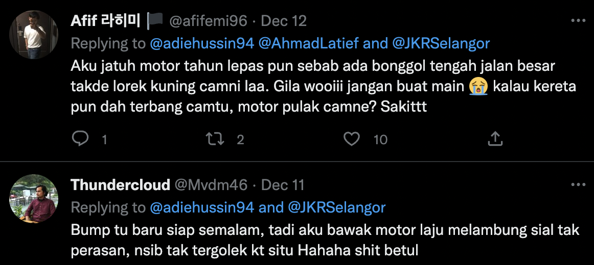 Seorang pengguna Twitter, Adie Hussin memuat naik video memaparkan situasi beberapa pengguna jalan raya nyaris kemalangan akibat kemunculan 'bonggol maut' di Seksyen 7, Shah Alam itu.