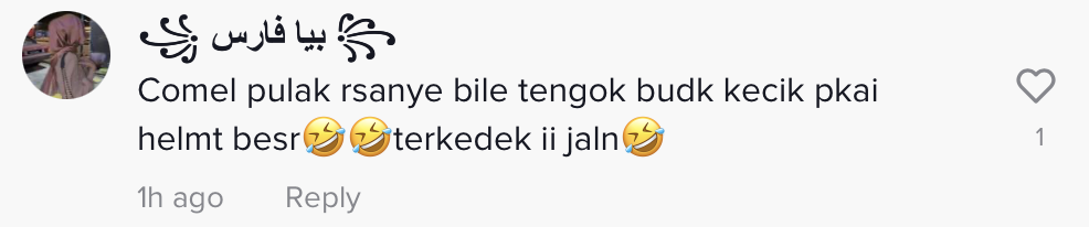Apa yang mengundang tawa adalah apabila budak lelaki itu dilihat memakai topi keledar motosikal yang besar dan berat.