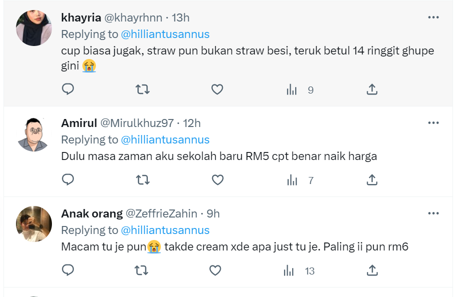 "Kedai ice blended depan sekolah aku harga RM3.00. Kalau nak topping, tambah rm0.50 je. Saiz cup lebih kurang ni" – Netizen
