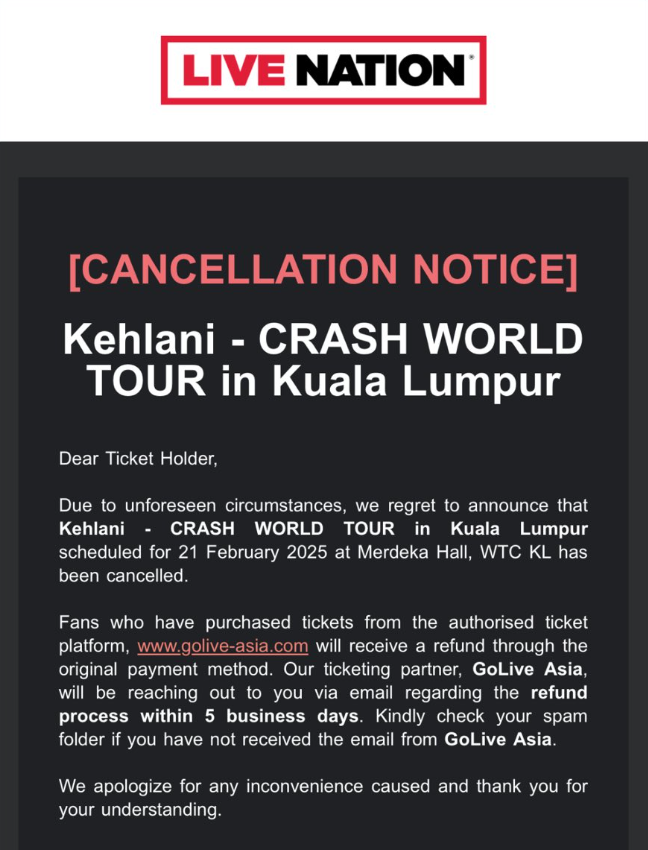Menerusi emel tersebut, pihak penganjur konsert, Live Nation memberitahu pembatalan itu dilakukan atas sebab berlaku situasi yang tidak dijangka.