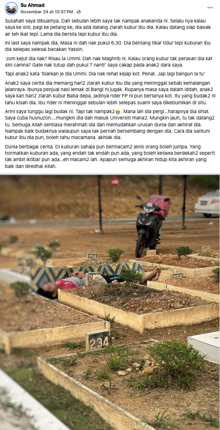 "Rupanya masa saya dalam iddah, anak-anak saya kan hari-hari ziarah kubur baba depa, jadinya rider FP ni pun bertanya kot. Itu yang budak-budak ni tahu kisah dia. Ibu rider ni meninggal sebulan lebih selepas suami saya dikebumikan di situ," tulisnya.