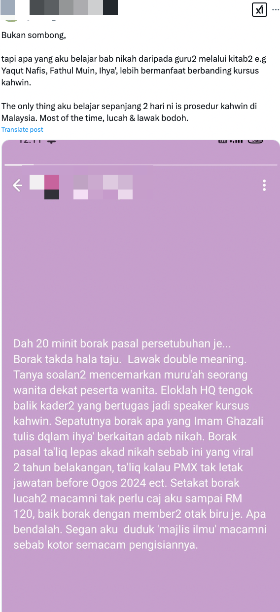 Namun, lain pula dengan perkongsian seorang individu yang meluahkan rasa kurang selesa dengan kursus perkahwinan yang dihadirinya.