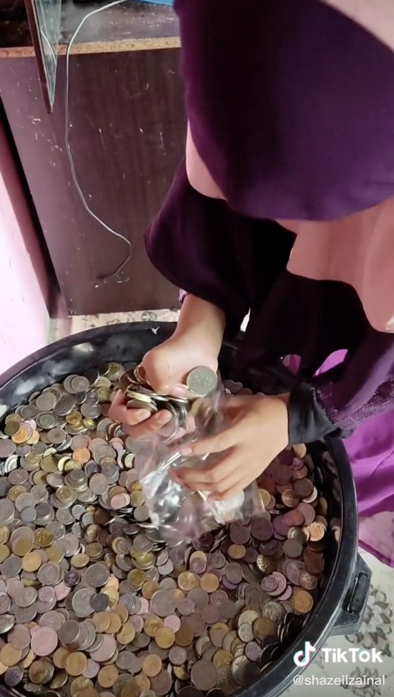 Menerusi video yang dimuat naik oleh @shazeilzainal di TikTok, kelihatan satu tong hitam yang dipenuhi duit syiling.