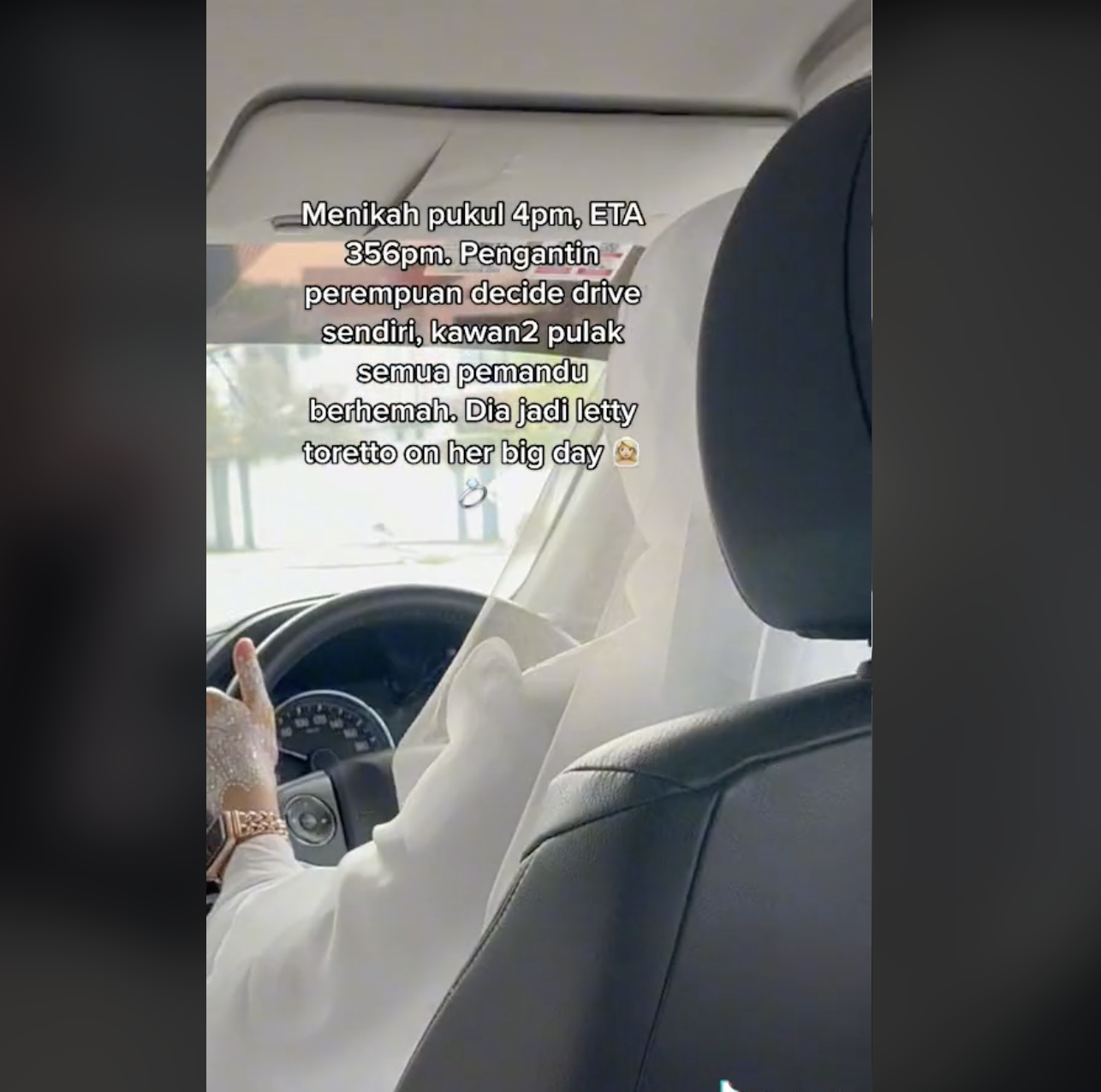Menerusi video yang dikongsi oleh @memanglowkey2_, kelihatan seorang wanita yang sudah lengkap berpakaian pengantin sedang memandu kereta.