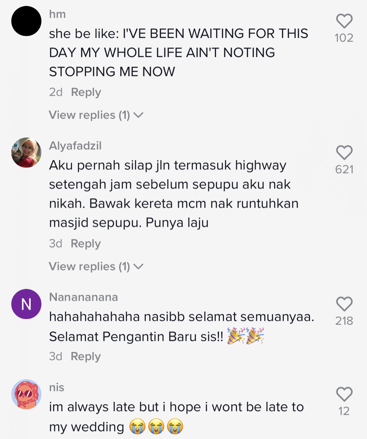 Malah, ada juga netizen yang berkongsi kisah mereka memandu kerana terlambat sebelum akad nikah.