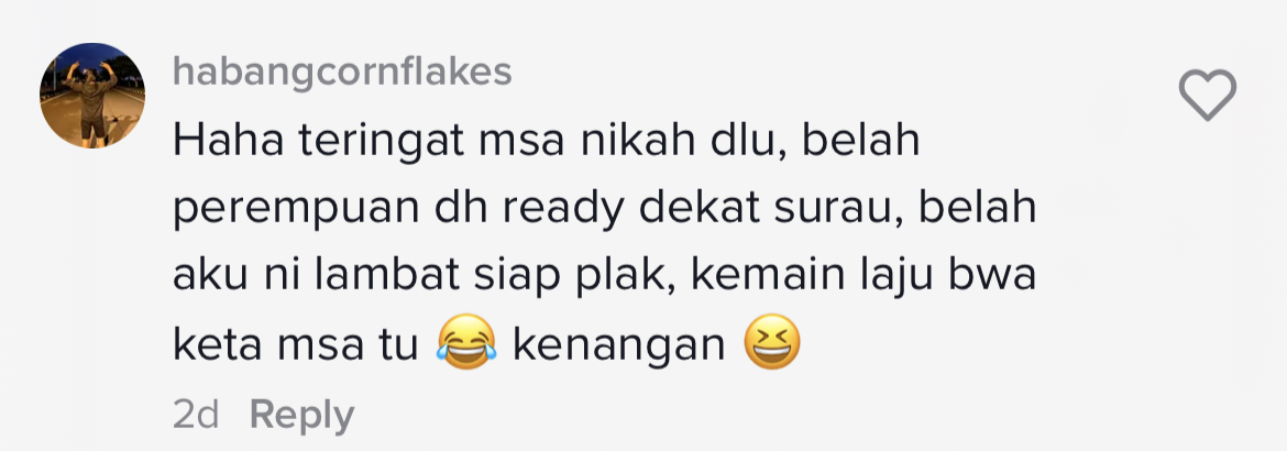 Susulan tularnya video berkenaan yang kini telah mendapat 423.4K views, 49.9K likes dan 296 comments di TikTok, rata-rata netizen turut terhibur melihat gelagat pengantin perempuan itu pada hari bahagianya.