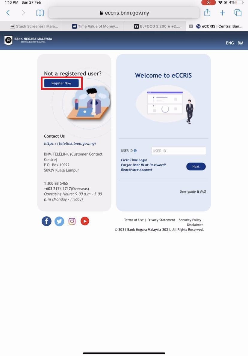 Perkara pertama anda perlu lakukan adalah dengan melayari eccris.bnm.gov.my untuk mendaftar terlebih dulu. Klik 'Register Now'.
