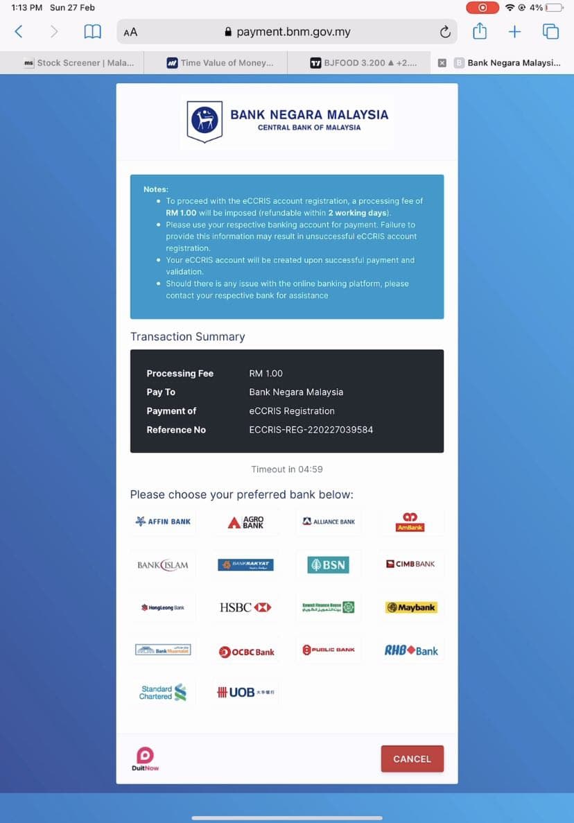 Anda kemudian diminta untuk memilih akaun bank online dan membuat pembayaran RM1.00.