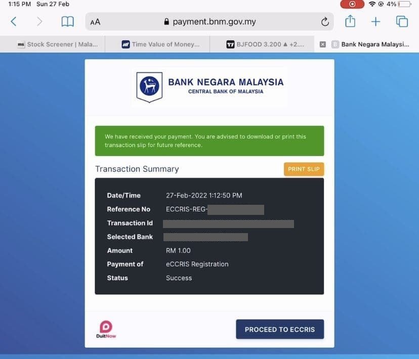 Selepas berjaya buat bayaran RM1, klik 'Proceed To eCCRIS' dan 'Proceed to First Time Login'