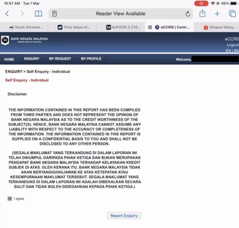 Selesai saja login, anda kini boleh menyemak laporan CCRIS anda dengan klik butang 'Enquiry'.Klik pada kotak kecil 'I Agree' dan 'Report Enquiry'