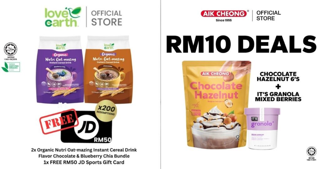 - Love Earth Organic: Nikmati promosi Mix & Match Granolove 2 pek pada harga RM7.70 (diskaun 21%). Dapatkan juga baucar RM7 dengan perbelanjaan minimum RM50 di seluruh kedai, atau beli mana-mana dua produk Oat-mazing untuk mendapatkan kad hadiah JD!