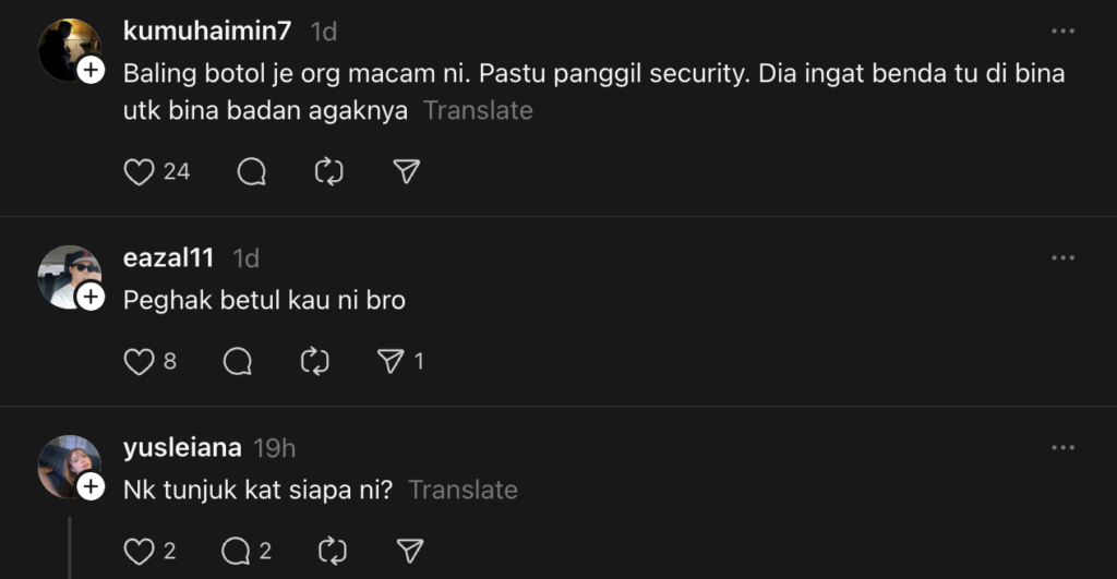 Menerusi posting di Threads, seorang wanita dikenali sebagai Hasmilawati berkongsi situasi tersebut yang disifatkan sebagai tidak wajar dan tidak bertempat.