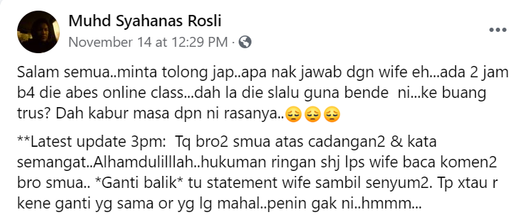 "Ada 2 jam before dia habis online class, dah la dia selalu guna benda ni ke buang trus?"Dah kabur masa depan ni rasanya," katanya menerusi posting tersebut.