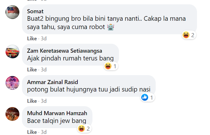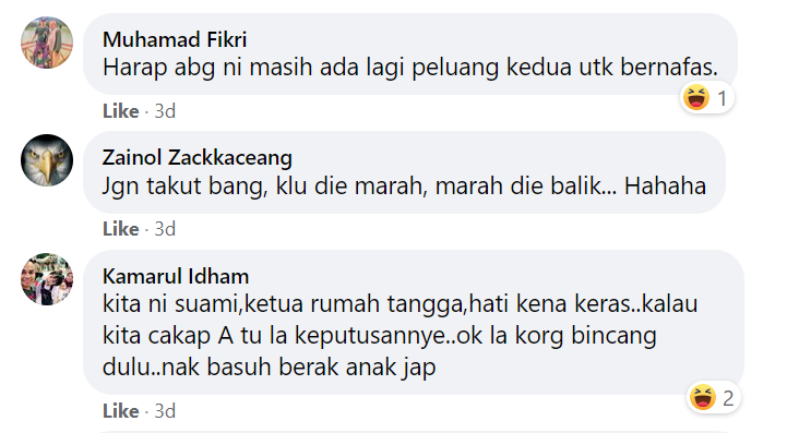"Salam semua minta tolong jap, apa nak jawab dengan wife eh"