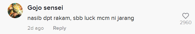 Dalam pada itu, tinjauan di ruangan komen mendapati rata-rata netizen turut merasa terhibur melihat gelagat lelaki tersebut. Malah, ada juga yang berpendapat perkara sebegini adalah luck kerana jarang berlaku.