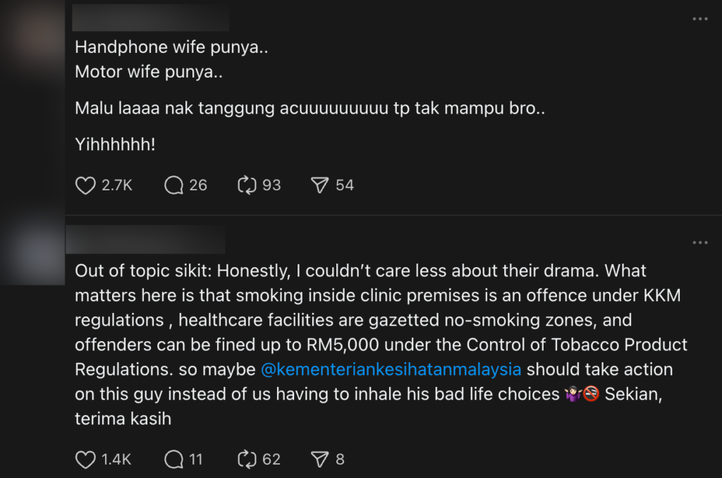 Situasi yang tegang itu kemudian terhenti selepas seorang kakitangan klinik datang menegur ketiga-tiga mereka, terutama apabila lelaki tersebut merokok dalam kawasan klinik.