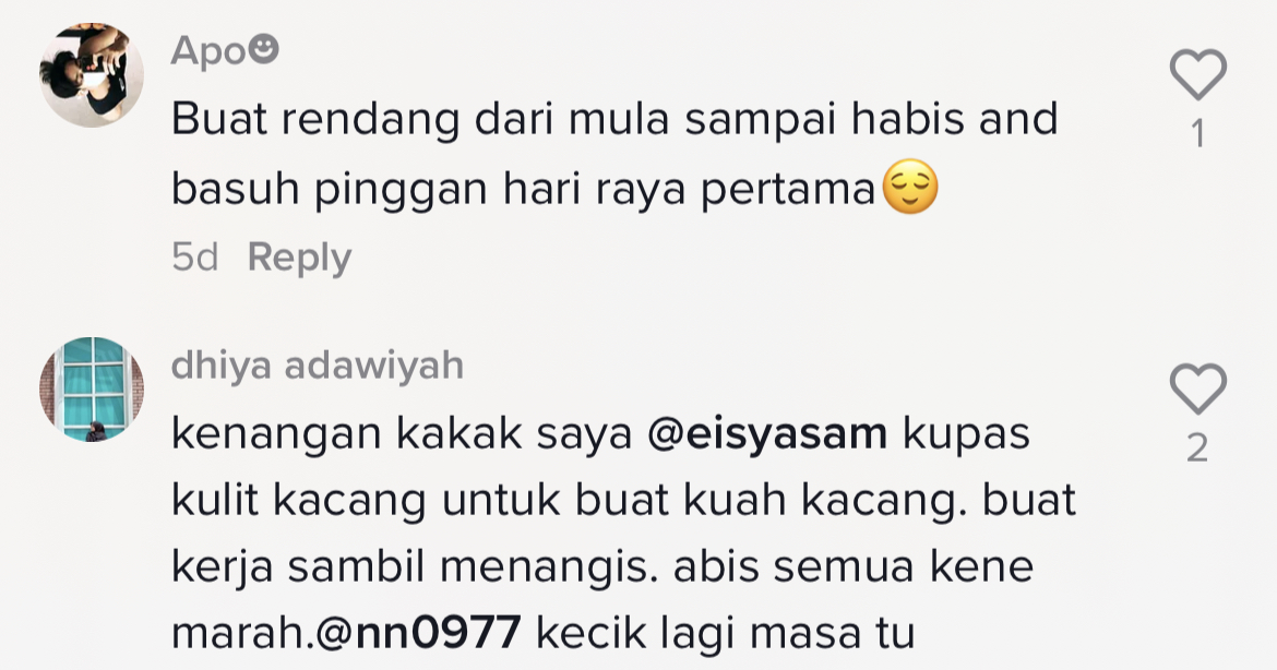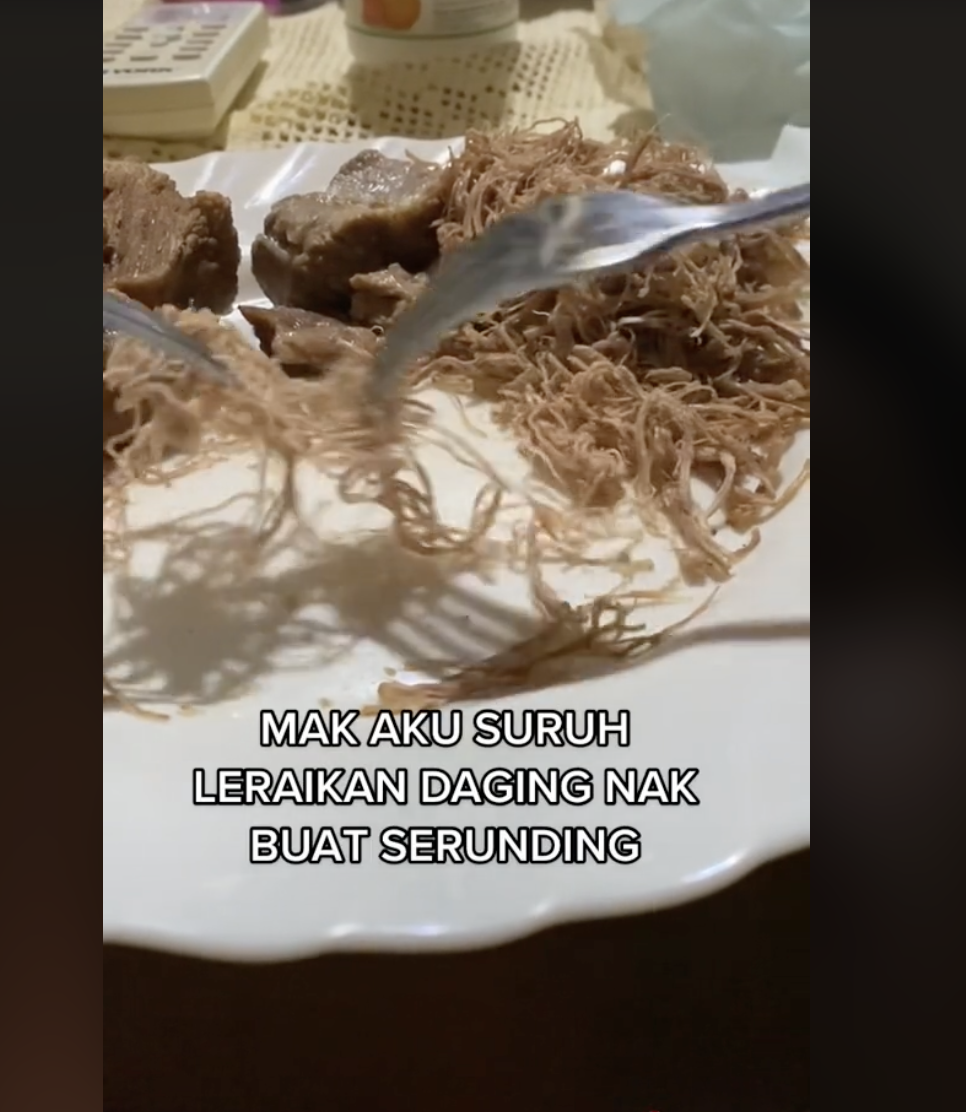 Dia kemudian berkongsi bahawa antara aktiviti persiapan raya paling penat perlu dilakukan adalah apabila ibunya menyuruh meleraikan daging untuk membuat serunding.