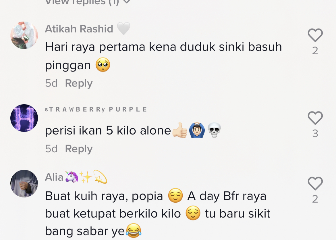 Lelaki tersebut sempat bertanya kepada orang ramai di ruangan kapsyen, apakah aktiviti persiapan raya paling penat yang mereka hadapi. Hal ini secara tidak langsung telah mencetuskan perbualan mengenai topik ini sesama netizen.