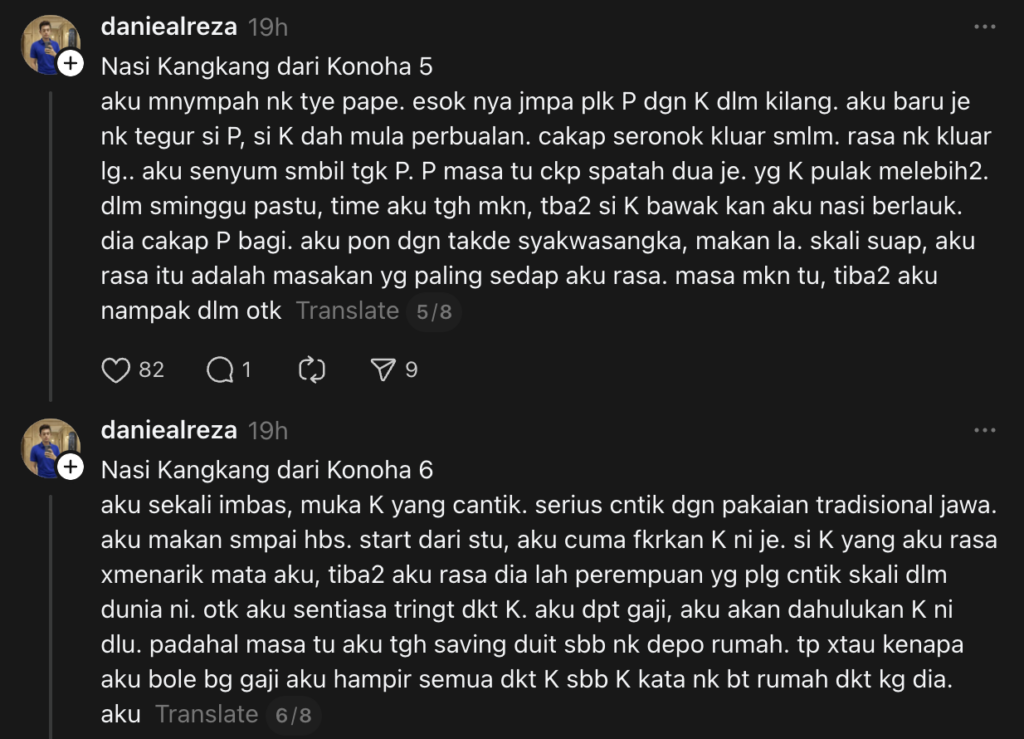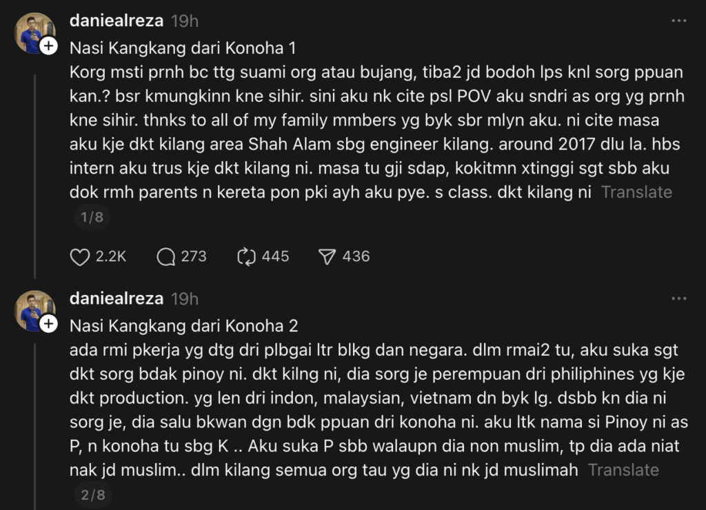 Menerusi ciapan yang dimuat naik oleh @daniealreza, segalanya bermula apabila dia jatuh hati kepada seorang pekerja kilang di tempat kerjanya.