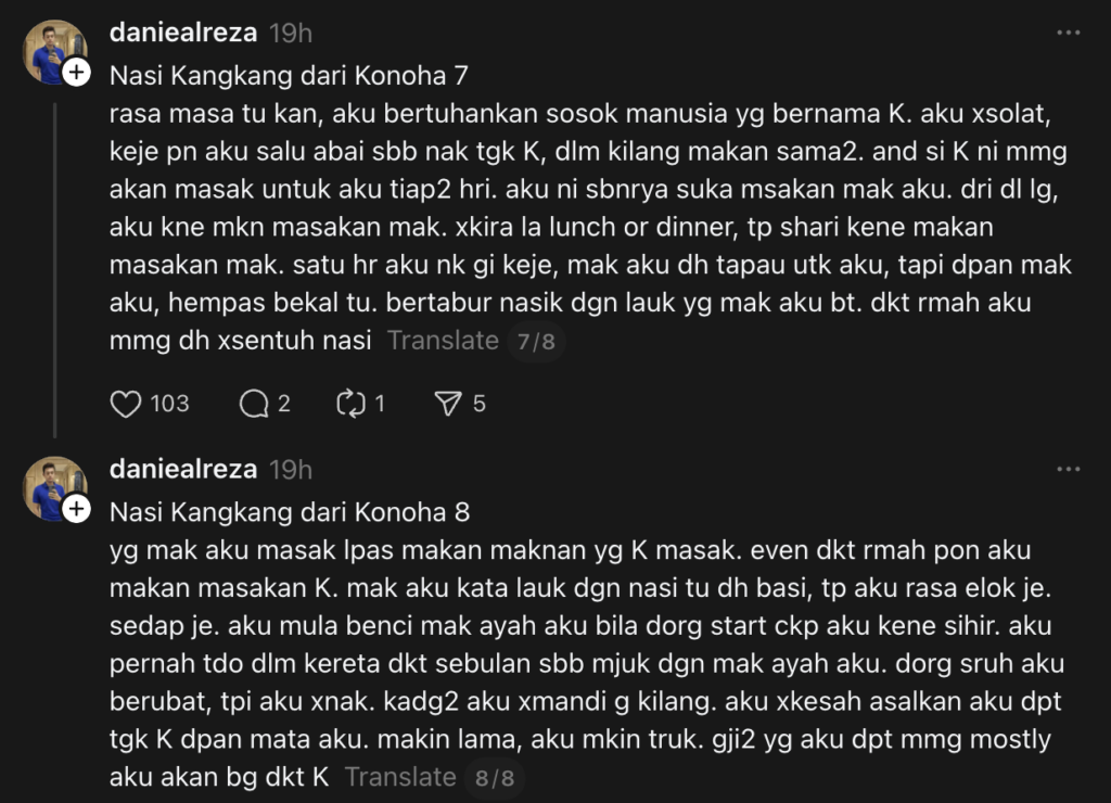 "Sekali suap, aku rasa itu adalah masakan yang paling sedap aku rasa. Masa makan tu, tiba-tiba aku nampak dalam otak aku sekali imbas, muka K yang cantik.