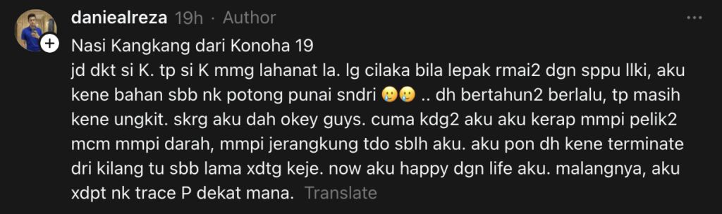 "Otak aku sentiasa teringat dekat K. Aku dapat gaji, aku akan dahulukan K ni dulu. Padahal masa tu aku tengah saving duit sebab nak depo rumah. Tapi tak tahu kenapa aku boleh bagi gaji aku hampir semua dekat K sebab K kata nak buat rumah dekat kampung dia," katanya.