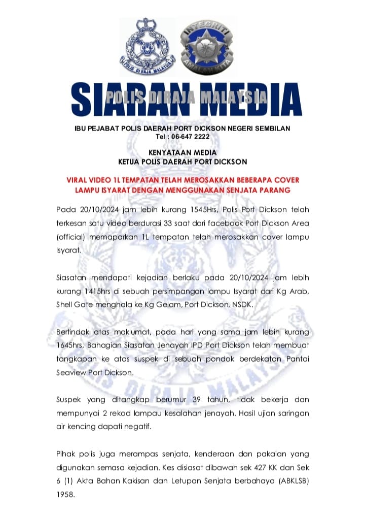 Menerusi kenyataan di Facebook, Ketua Polis Daerah Port Dickson, Superintendan Maslan Udin berkata, pihaknya telah mengesan video tular berdurasi 33 saat kira-kira pukul 3.45 petang.