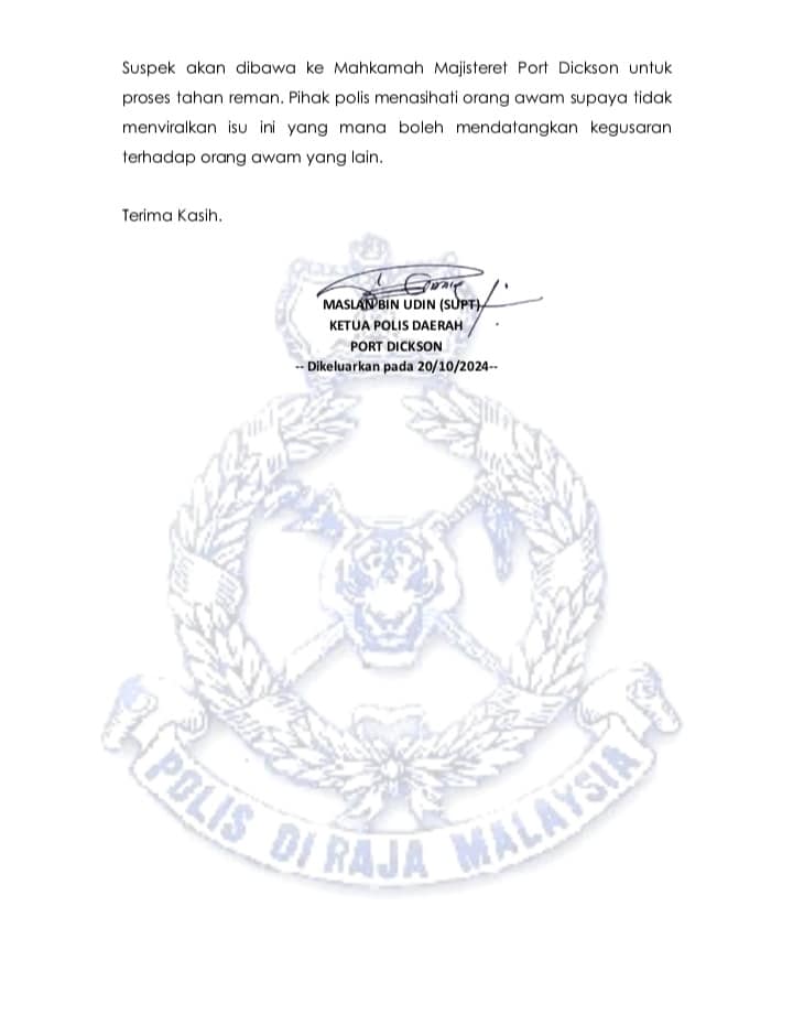 Suspek akan dibawa ke Mahkamah Majistret Port Dickson untuk proses tahan reman.
