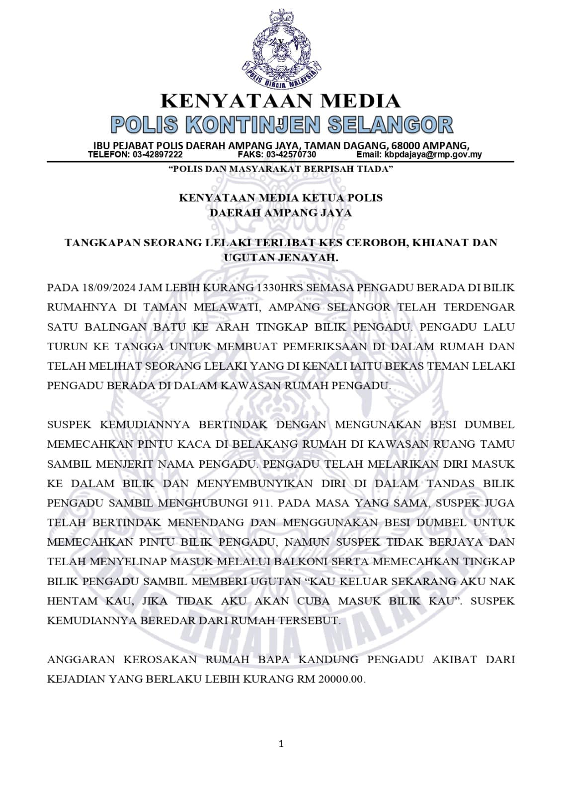 Difahamkan, suspek telah berjaya ditahan pihak polis.