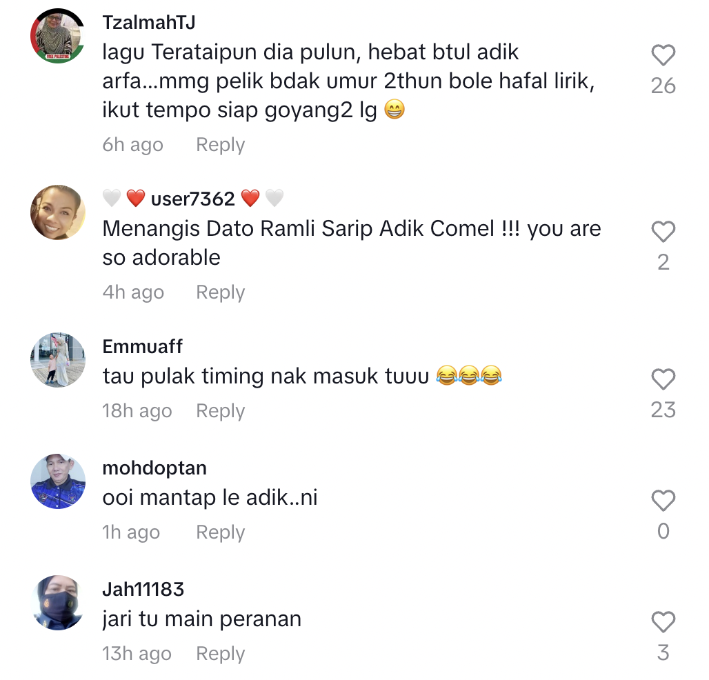 Nyanyian budak berkenaan ternyata mendapat perhatian ramai yang memuji kecomelan dan bakatnya dalam menyanyikan lagu tersebut.