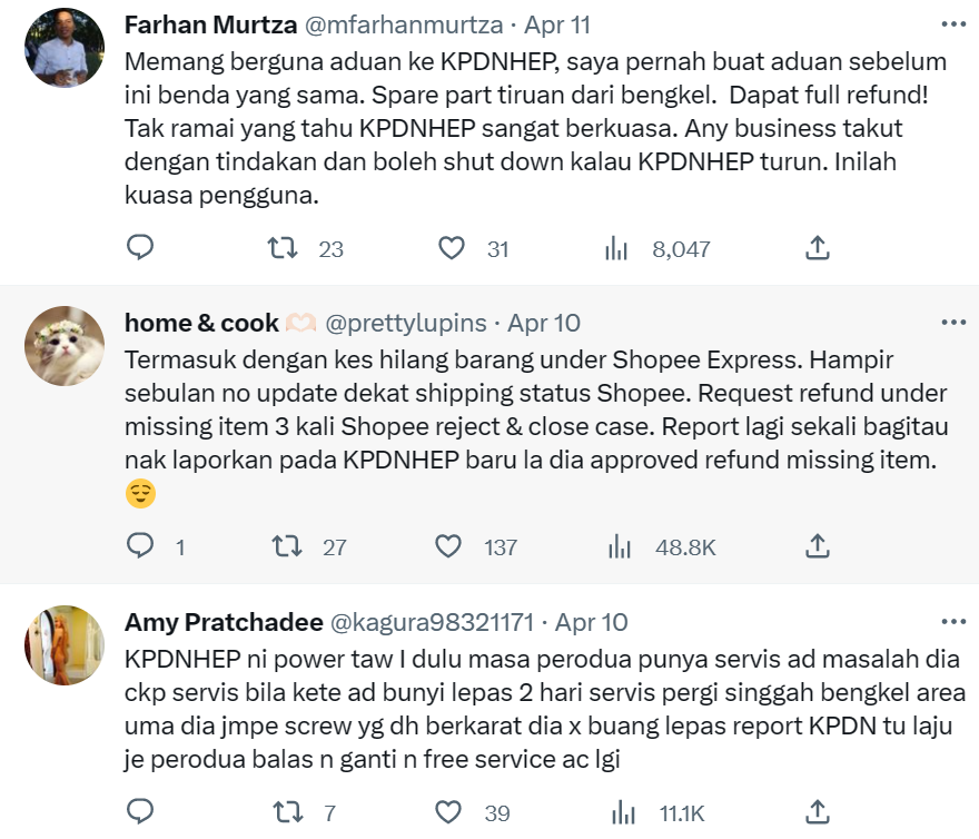 Dalam ciapan itu dapat dilihat screenshot perbualan antara dia dan seller tersebut di mana dia telah berjaya mendapatkan full refund apabila dia menyatakan yang dia sudah melaporkan isu tersebut kepada pihak KPDNHEP.