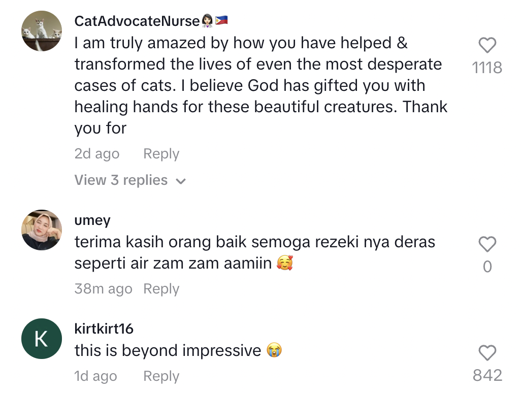 Di ruangan komen netizen turut memuji tindakannya yang baik hati kerana sanggup merawat kucing berkenaan sehingga sembuh.