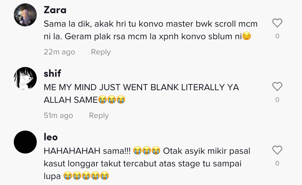 "Benda dahlah sekali seumur hidup je, pastu boleh pula otak aku jem atas stage tu macam bawa dulang guys," tulisnya di kapsyen.