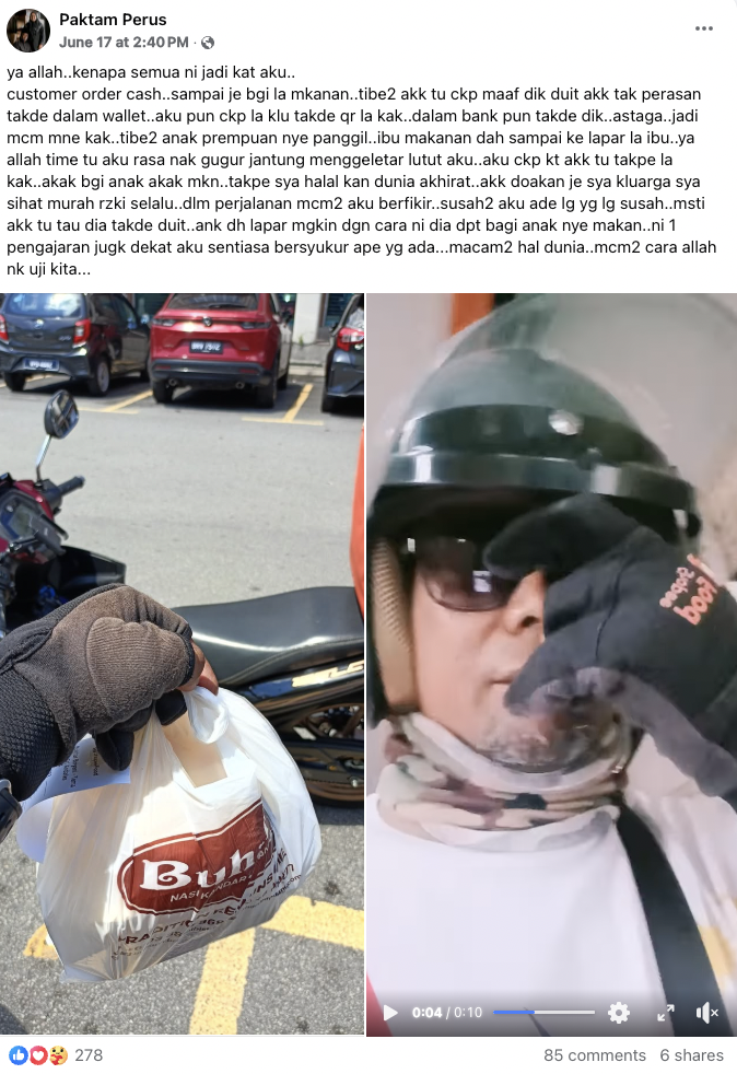 Menerusi perkongsian di Facebook Paktam Perus, seorang lelaki itu berkongsi pengalamannya ketika menghantar pesanan makanan secara bayaran tunai semasa penghantaran (COD).