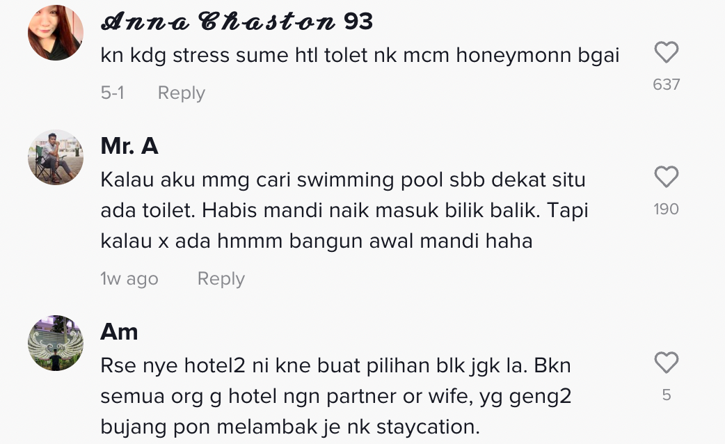 Namun, mereka mula menyedari yang tandas hotel tersebut boleh dilihat jelas dari atas. Disebabkan itu, semua terhibur dan memikirkan bagaimana cara mereka mahu mandi takut nanti ada yang 'memerhati' pula.