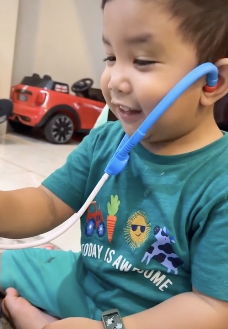 Apa yang menghiburkan ramai adalah apabila dia nampak bersungguh-sungguh menggunakan permainan stethoscope itu sambil siap memejamkan mata seolah-olah membuat rawatan sebenar.