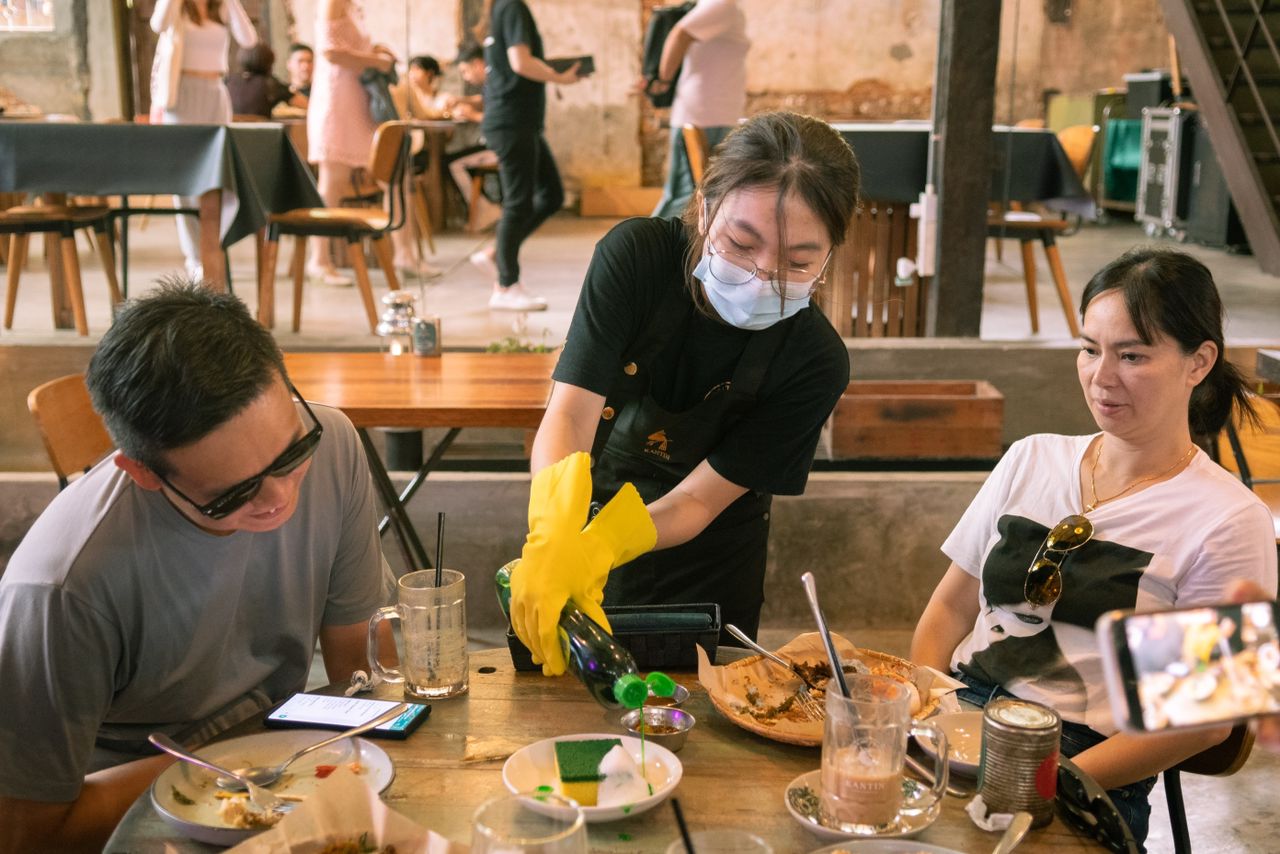 The cafe introduced a rather special yet unusual menu item, served by a waiter wearing yellow dish gloves squirting lime-green soap over a sudsy dish sponge.