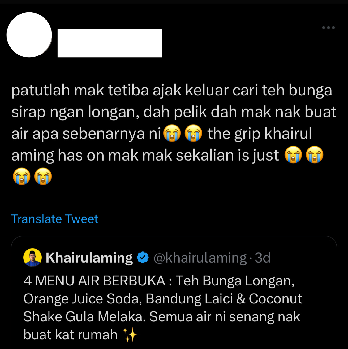"No wonder my mom suddenly asked me to go look for chrysanthemum tea and longans, I was confused as to what drink she wanted to make. The grip Khairul Amin has on mothers everywhere is just [strong]", one user wrote.