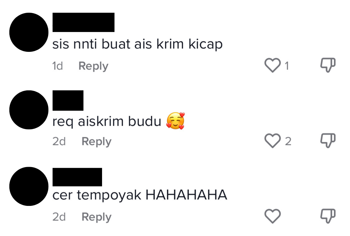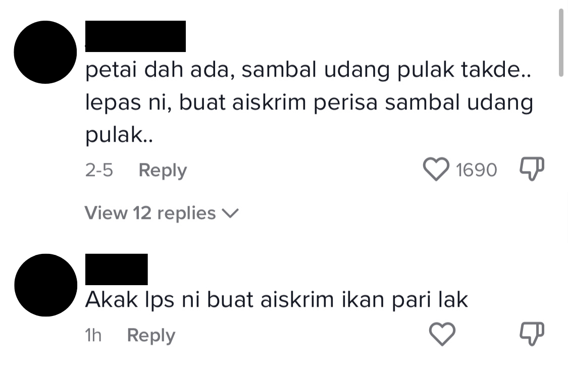 Some users jokingly suggested that she make more savoury ice cream flavours, ranging from belacan to the Kelantanese anchovy sauce budu, the fermented durian condiment tempoyak, and even soy sauce.