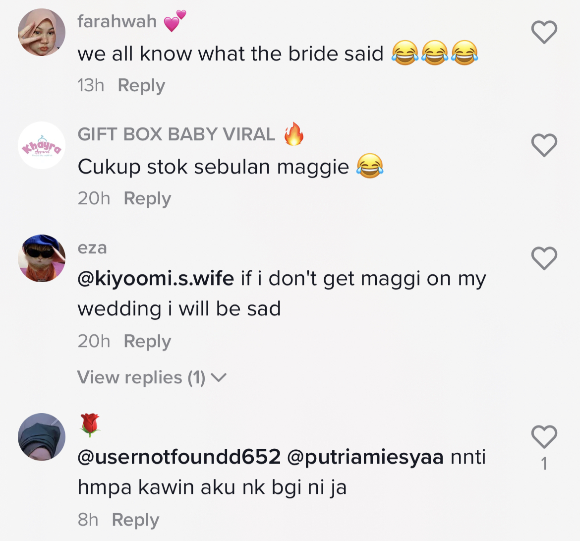 Tinjauan di ruangan komen pula mendapati rata-rata netizen turut terhibur dengan hadiah yang diterima oleh pengantin perempuan itu. Terdapat juga netizen yang berharap mereka dapat menerima hadiah yang sama semasa majlis perkahwinan nanti.