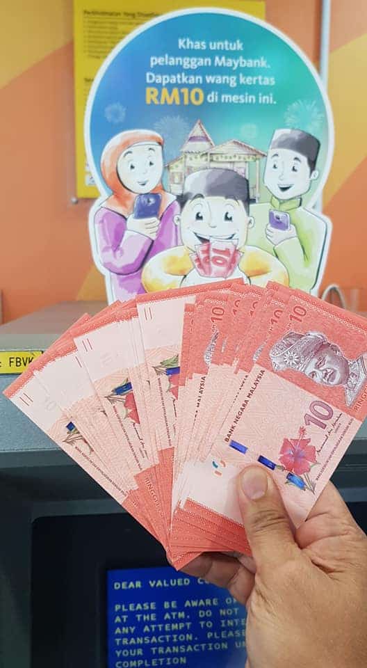 Pergi ke cawangan Maybank terdekat (Maybank terpilih sahaja), pilih mesin ATM yang ada gambar tertera 'dapatkan wang kertas RM10 di mesin ini' yang boleh anda dapatkan duit raya baru.