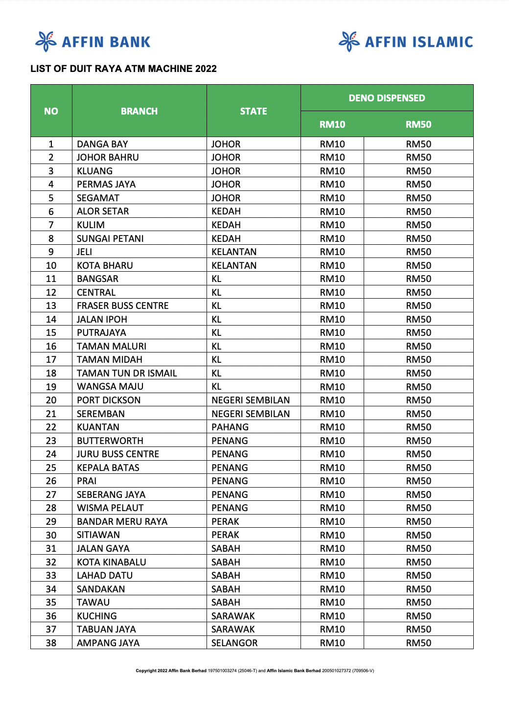 Terdapat sejumlah 51 cawangan Affin Bank dan Affin Islamic yang mempunyai mesin ATM Raya yang bernilai RM10 dan RM50.
