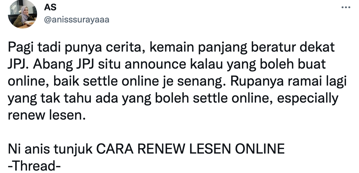 Namun, tahukah anda sebenarnya anda kini memperbaharui lesen anda secara online saja. Ikuti perkongsian daripada pengguna Twitter bernama @anisssurayaaa ini.