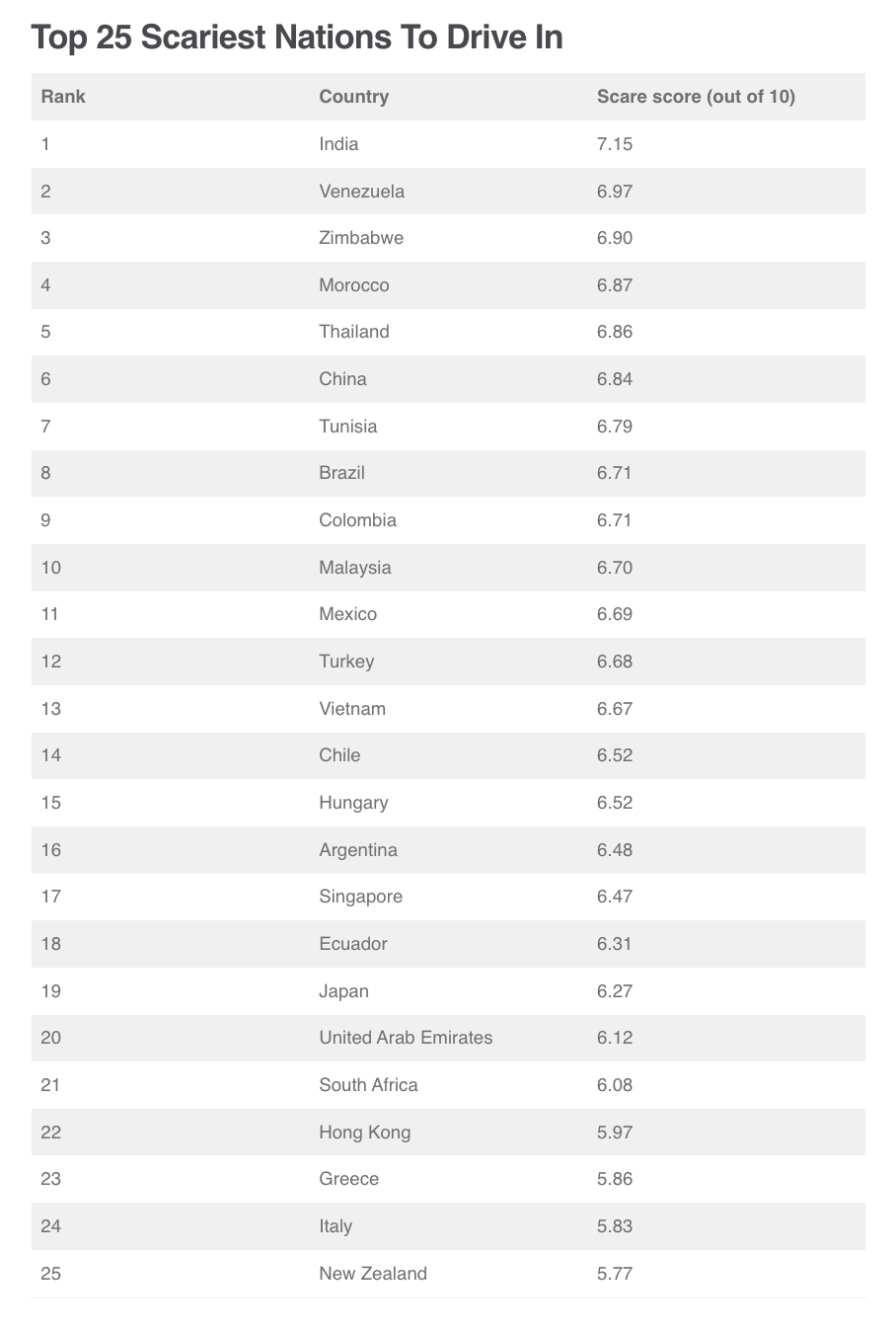 India menduduki tempat teratas dengan 7.15 daripada 10 pada skala menakutkan, menjadikannya negara paling menakutkan bagi warga asing untuk memandu masuk.