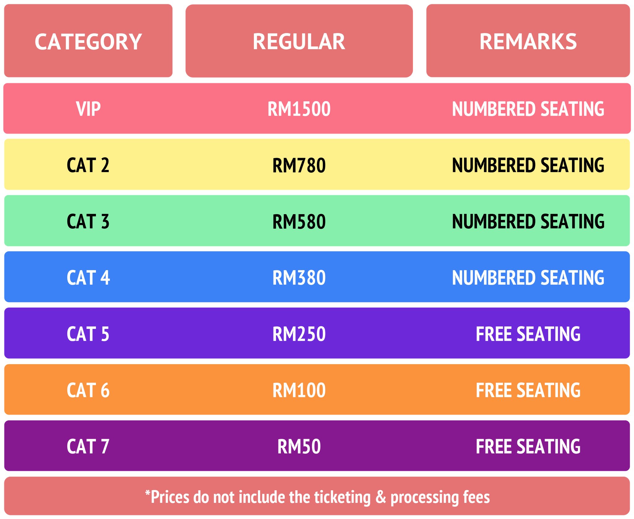 Berikut adalah senarai harga tiket yang tersedia mengikut kategori: